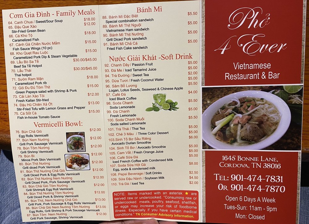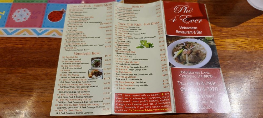 Introducing the menu at Pho 4 Ever, a Vietnamese restaurant located in Memphis, TN, offering a cozy and casual dining experience. Customers rave about the authentic and flavorful dishes, with highlights including the chicken and shrimp pho, chicken banh mi, taro and avocado smoothies, and Vietnamese drinks. The pho is regarded as the best in town, with rich and flavorful broth that warms the soul. Other must-try dishes include the papaya salad, grilled pork chop, and fish sauce chicken wings. The variety of options on the menu makes it a perfect spot for those looking to try a little bit of everything. With great customer service, a big menu, and reasonable prices, Pho 4 Ever stands out as one of the best Vietnamese restaurants in Memphis.